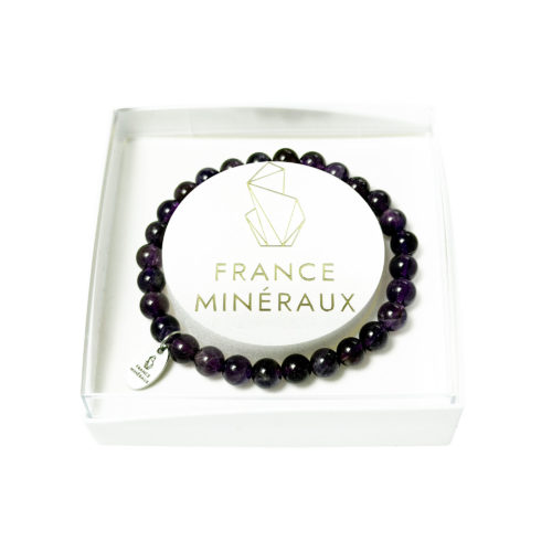 Ce bracelet est composé de 29 perles d’améthyste 6mm sur fil élastique, fabriqué artisanalement en France. Pierres 100% naturelles. .