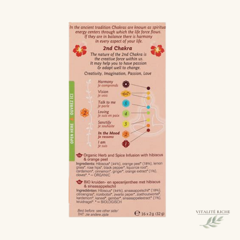 Hibiscus, orange et poivre noir — une infusion pour éveiller ta créativité et harmoniser ton 2ème chakra. Sans caféine. 16 sachets bio.